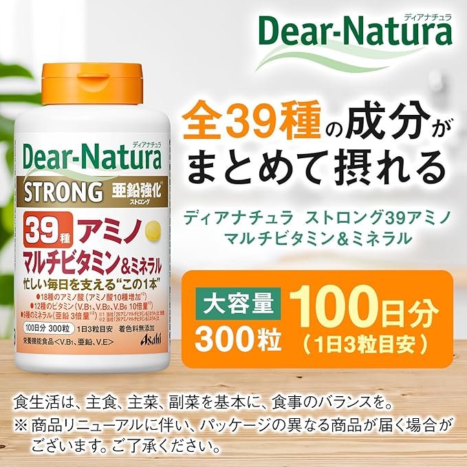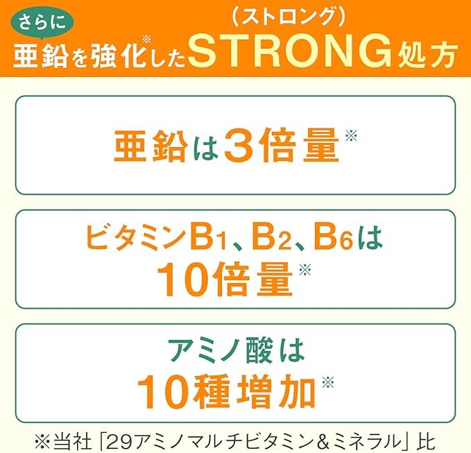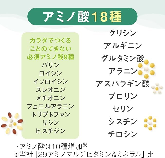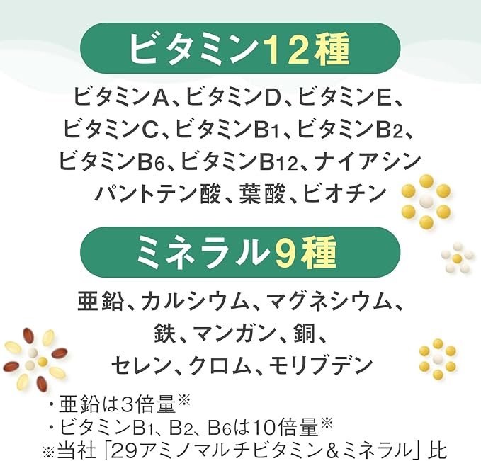 デキストリン(国内製造)、マンガン含有酵母末、還元パラチノース、セレン含有酵母末、モリブテン含有酵母末、クロム含有酵母末/貝Ca、酸化Mg、V.C、グルコン酸亜鉛、アルギニングルタミン酸塩、セルロース、アラニン、グリシン、リシン、ロイシン、フェニルアラニン、メチオニン、バリン、イソロイシン、ケイ酸Ca、ヒスチジン、アスパラギン酸Na、スレオニン、V.B6、プロリン、V.B2、ナイアシン、ステアリン酸Ca、V.B1、糊料(プルラン、HPMC)、トリプトファン、セリン、ピロリン酸鉄、酢酸V.E、セラック、パントテン酸Ca、シスチン、グルコン酸銅、チロシン、V.A、葉酸、ビオチン、V.D、V.B12